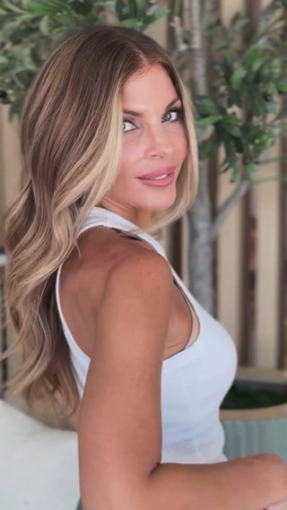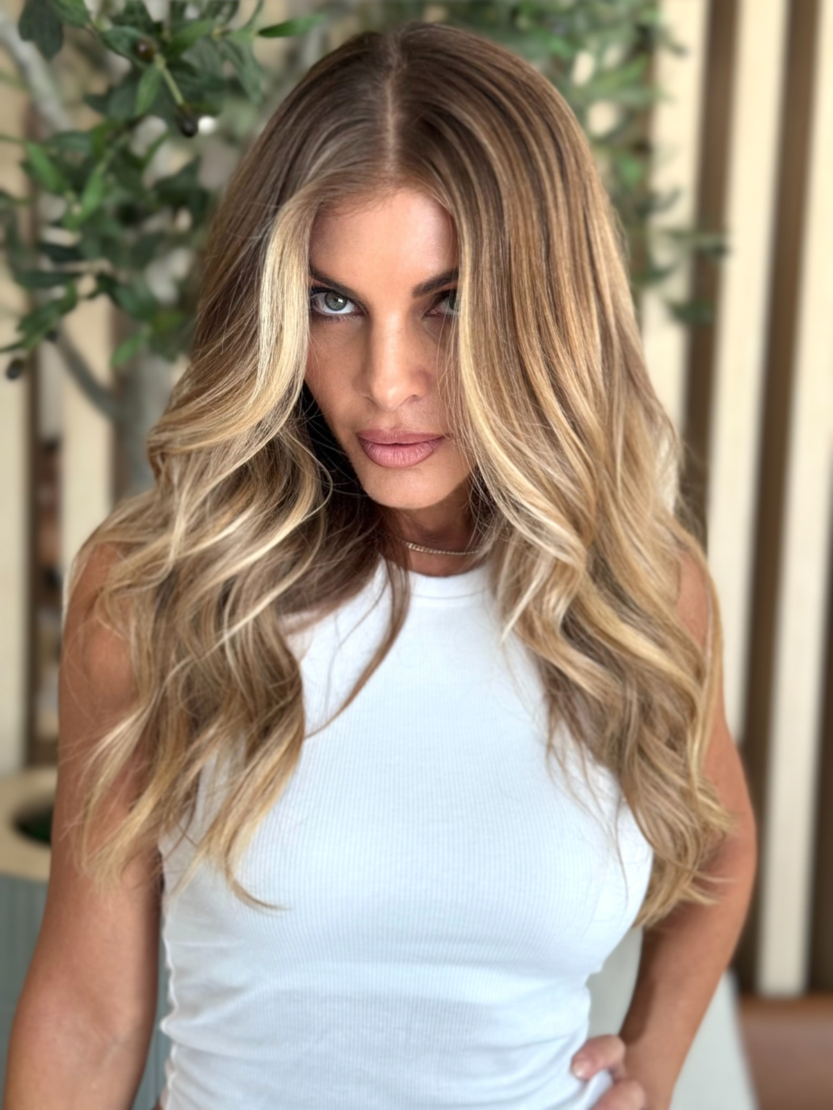 Mary is a blended shade rooted with a natural level 6, melting seamlessly into soft beige blondes and golden caramel tones.
